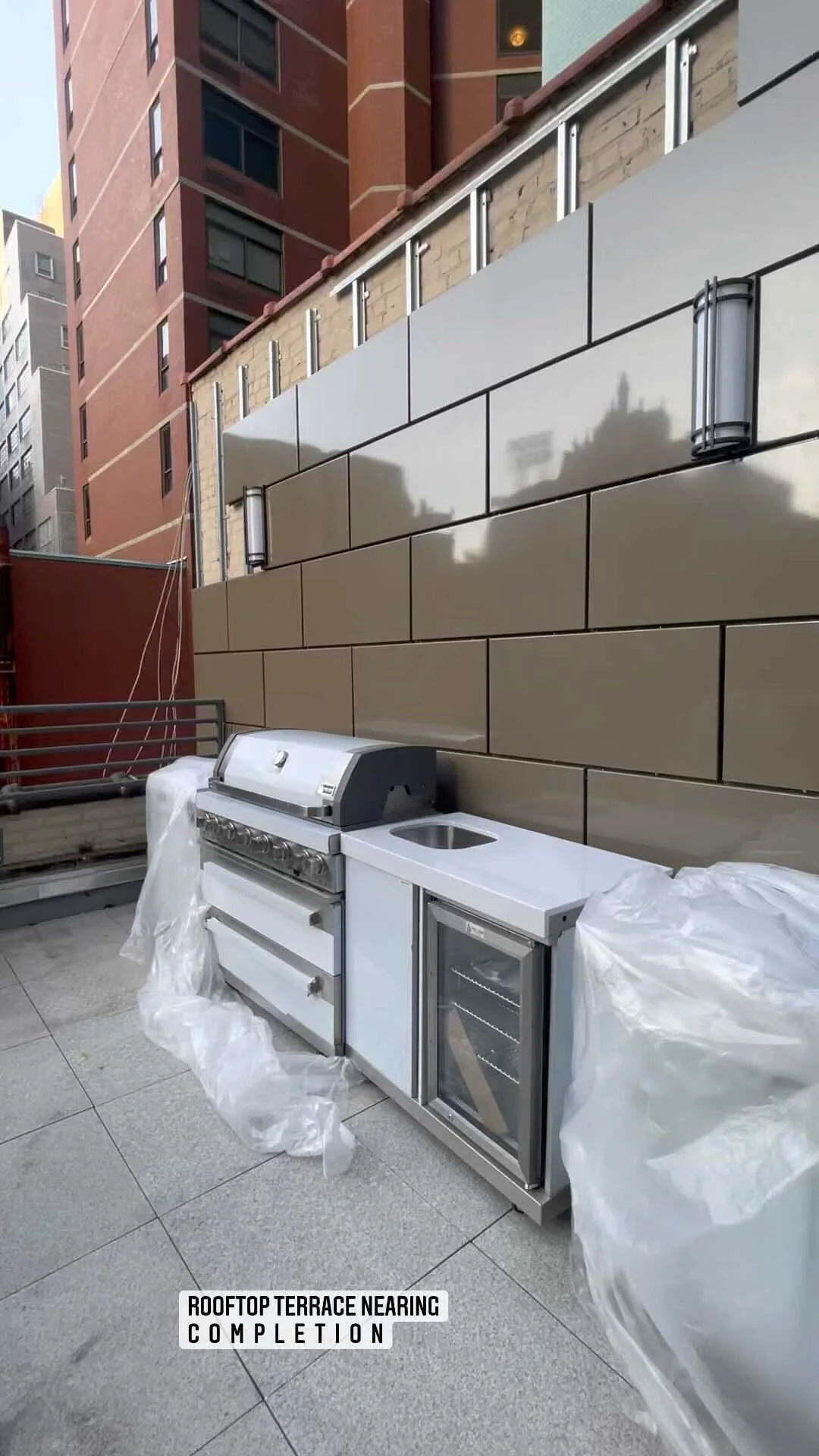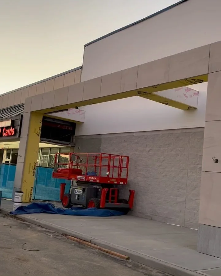 Prepping to install Limestone and Granite panels on the facade at CHS Long Island